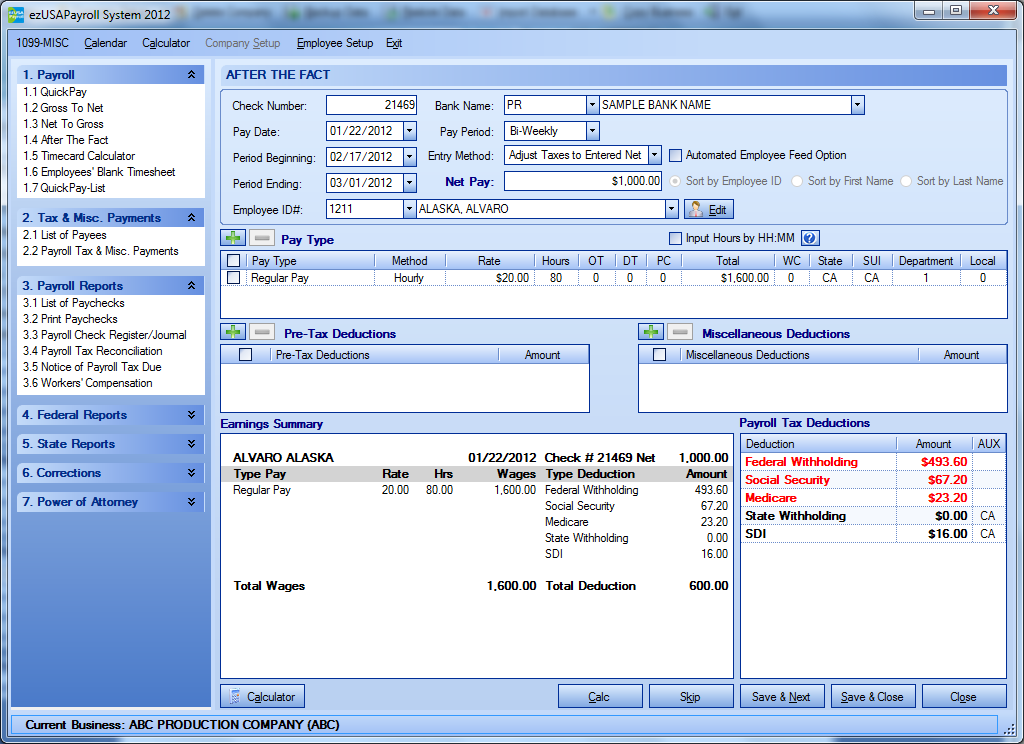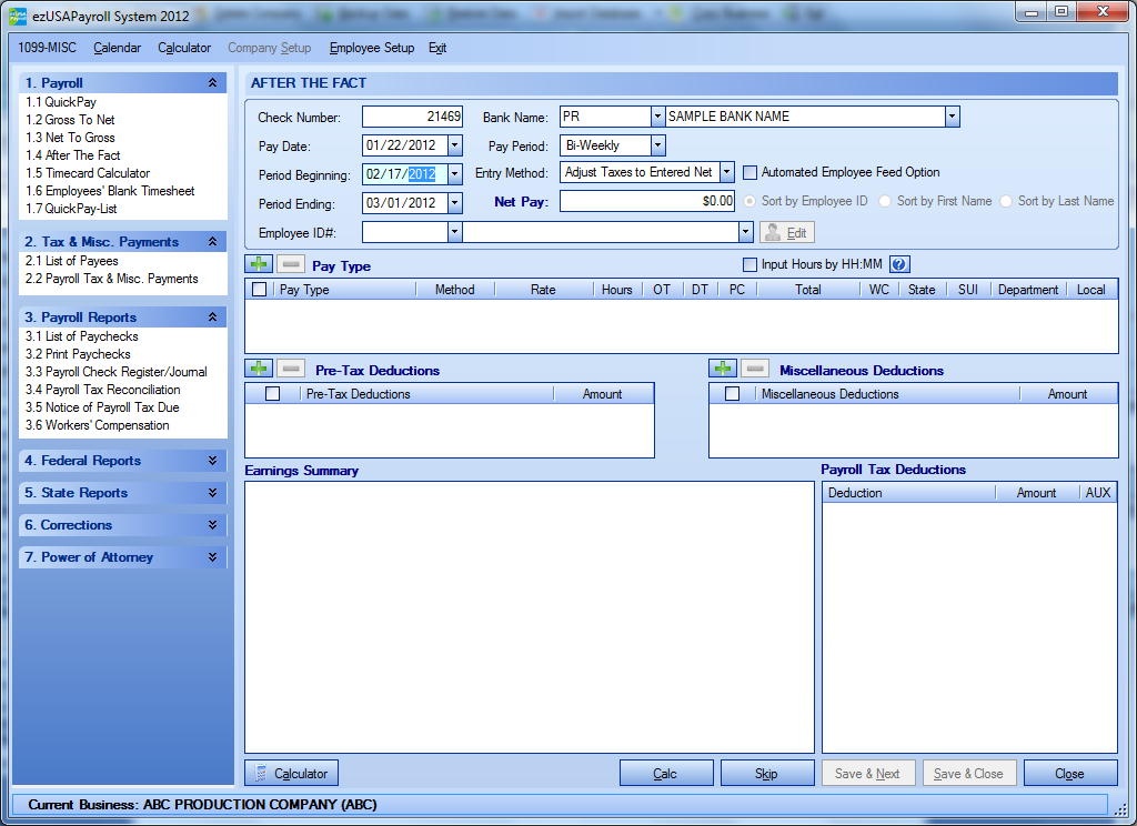 Method: As Entered. Enter Gross Pay, Taxes, Misc. Deductions as indicated.