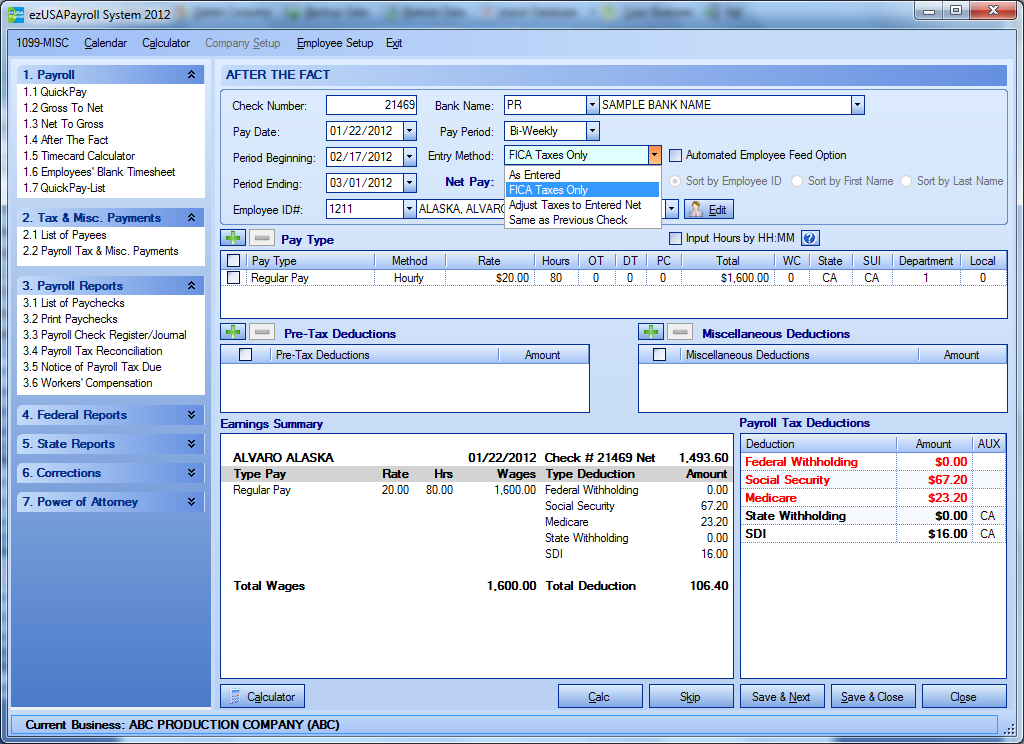 Method FICA Taxes Only. Program will calculate all applicable required for Social Security Tax, Medicare & State Disability only. The rest goes to Net Pay.