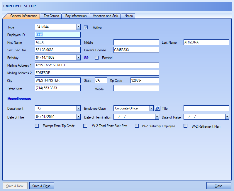 Enter necessary information about employee.