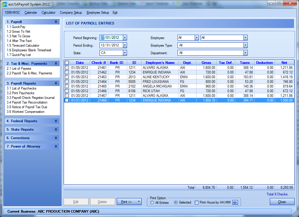 Enter or double click and select Period Beginning, Period Ending, State, Employee, Employee Type from drop-down to show Payroll entries that calculated.