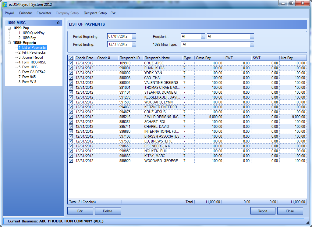 Enter or double click and select Period Beginning, Period Ending, Recipient, 1099-Misc Type from drop-down to show Payroll entries that calculated.