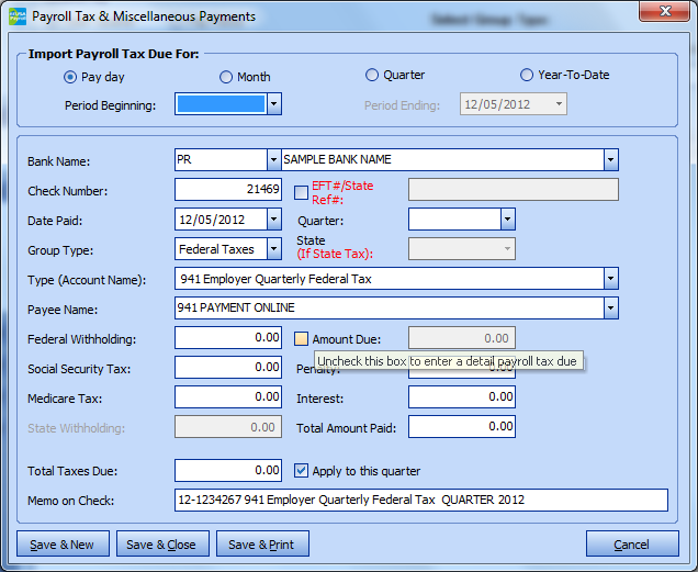 - Bank Account: Select the checking account the tax deposit is to be written from.