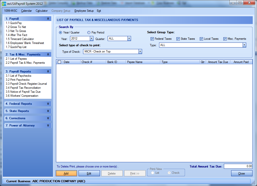 - Group Type: Select one of 4 groups: Federal Taxes, State Taxes, Misc. Payment, and Local Taxes.
