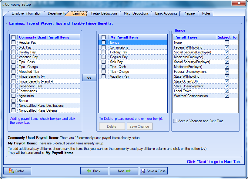 To add additional payroll items, check mark the items that you want and click on the button (>>). They will be showed in My Payroll Items.