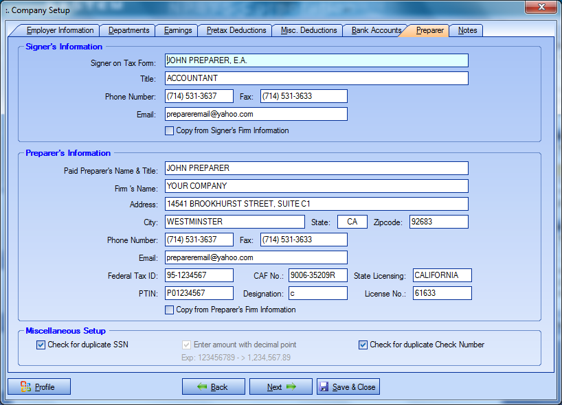 Enter Preparer’s information (It will be shown in Tax Form).
