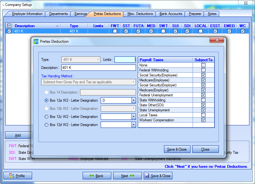 Setup Box12a, Box12c, Box12d that shown in W2 Form.