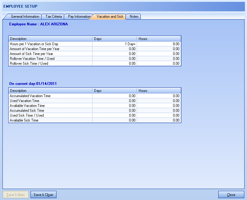 Hours per 1 Vacation or Sick Day: Enter the number of hours the employee works per day, normally 8.